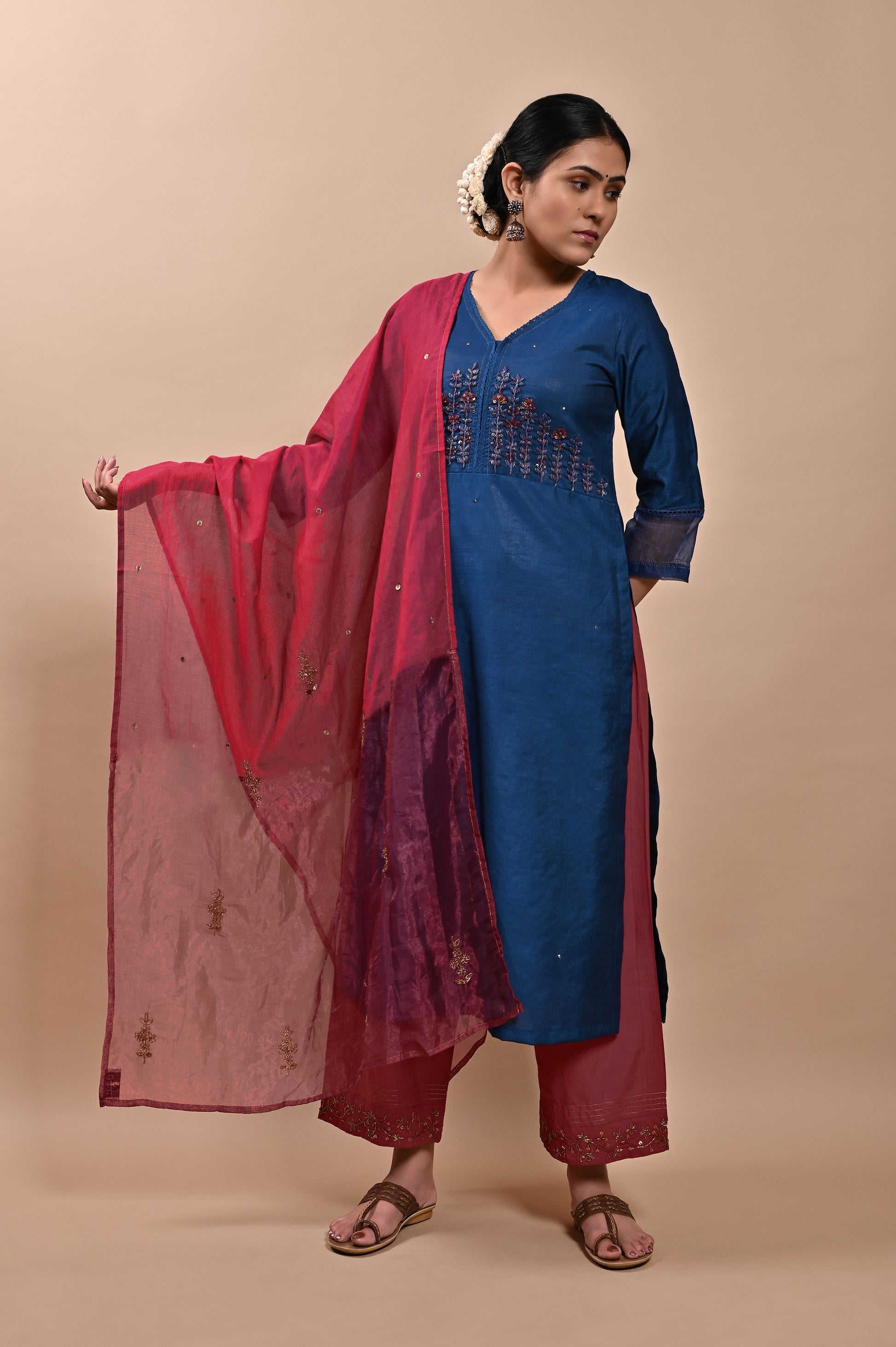 - STYLING TIP: You can style this Wine Silk Chanderi Zardozi Dupatta from Label Yati by pairing them with a matching suit set and accessorizing them with a pair of necklace, jhumkas, and embroidered mojaris.