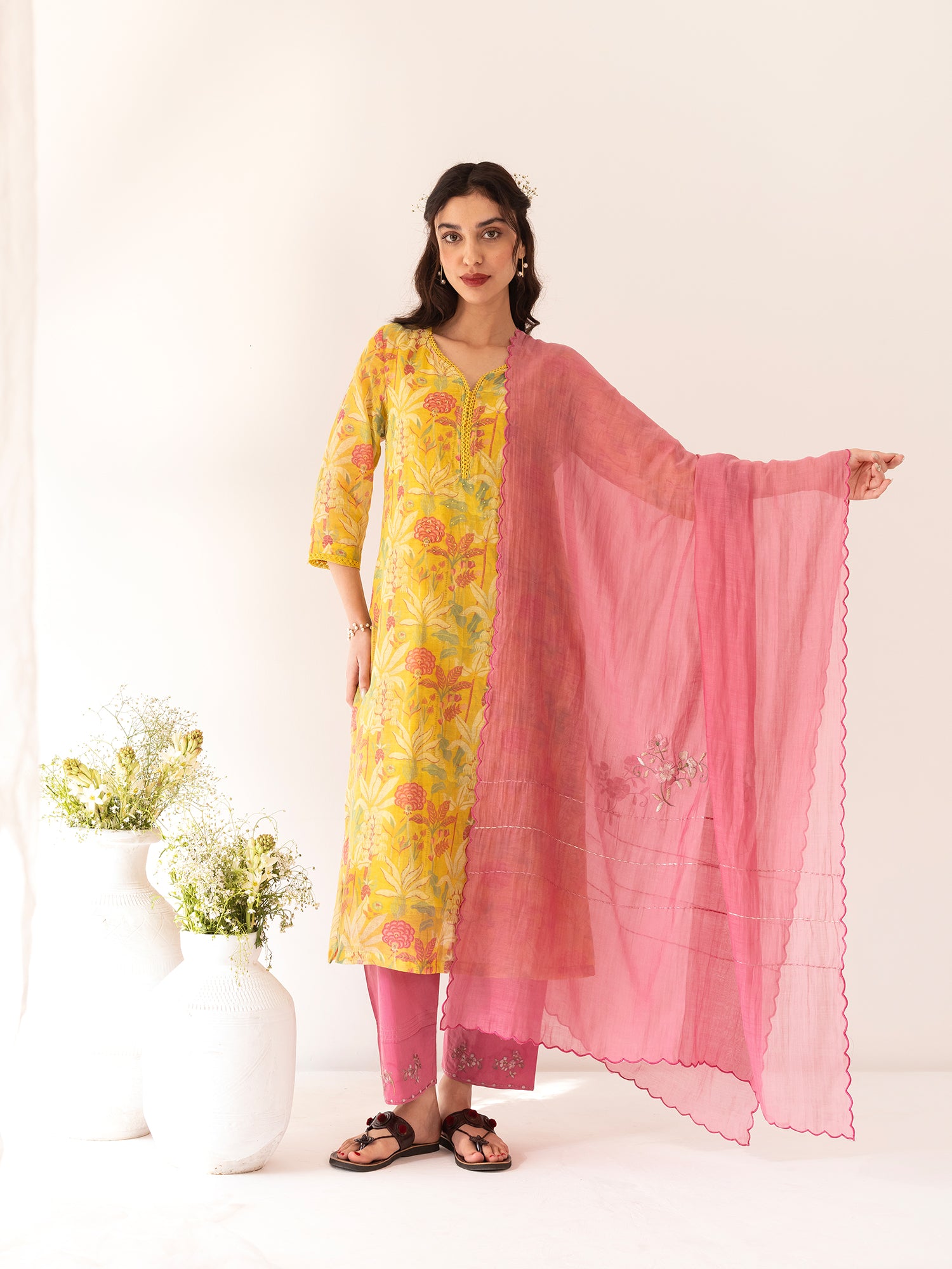 Yellow and pink floral printed mul chanderi beadwork kurta set
